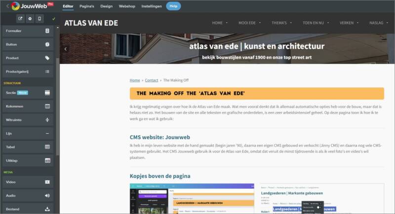 Ik heb in mijn leven ooit websites met de hand gemaakt in HTML1-4 (vanaf begin jaren '90), daarna met webeditors gewerkt, daarna een eigen CMS gebouwd en verkocht (Jinny CMS) en daarna nog vele CMS-systemen van anderen gebruikt. Het CMS Jouwweb gebruik ik sinds de start voor de Atlas van Ede, omdat dat veruit de minst tijdrovende is als ik veel foto's en video's wil plaatsen. Het bouwen gaan daarmee snel en foutloos.