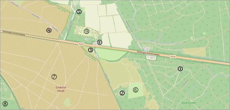 Uitleg bij de kaart: (1)= Mechelse Kuil, (2)= 't Wijde Veld, (3)= schaapskooi Zuid-Ginkel, (4)= monument Belgisch Vluchtoord, (5)= Natuurcentrum, (6)= raatakkers (celtic fields) en grafheuvels, (7)= Ginkelse Heide, (8)= bosgebied De Sijsselt, (9)= camping, (10)= groot parkeerterrein en horeca.