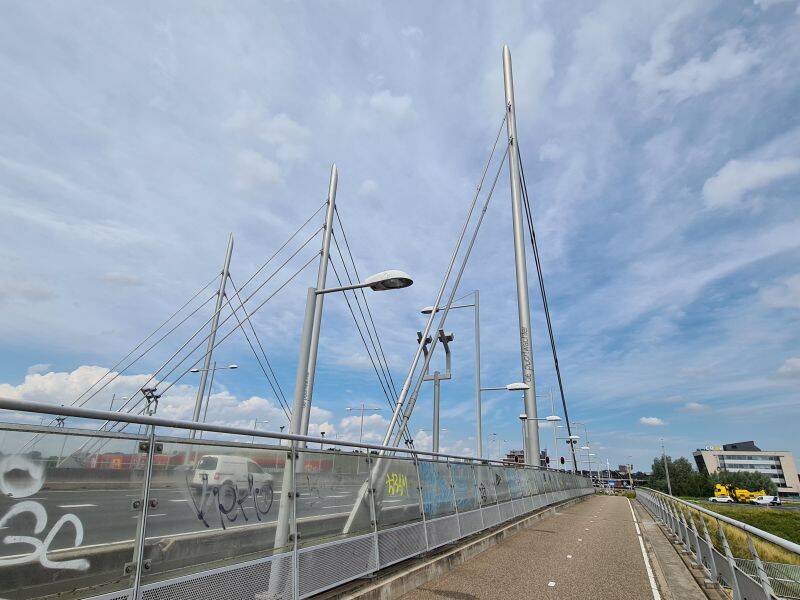 Sommige mensen zullen dit geen mooi plekje vinden, maar bij de Poortwachter bruist het van het leven. Vanaf het viaduct heb je een prachtig uitzicht op de A12, de daar startende Parklaan, de carpoolplaats en de geluidswal, met daarop een wijngaard en erin een bioscoop. Over de geluidswal kun je mooi wandelen en fietsen, met een uitzicht over de wijk de Rietkampen. Alle foto's: Allard Bijlsma.