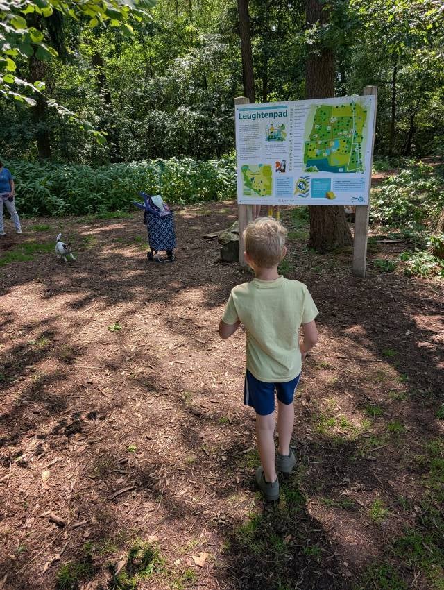 Lengte: ongeveer 1,5 km route. Toegankelijkheid: het pad is vrij toegankelijk tussen zonsopgang en zonsondergang. Je kunt parkeren bij Resort Renswoude aan de Barnveldsweg. Voor extra beleving kun je (in het seizoen) bij de receptie een rugzak met veldwerkmateriaal lenen (boekje met opdrachten, zoekkaarten, loeppotje, schepnet) om de route interactiever te maken. Kosten: ongeveer € 3,50 per rugzak/route. Opening receptie / beschikbaarheid van de rugzakservice: de receptie van De Leughte is in de maanden oktober t/m maart beperkt geopend (weekenden en bepaalde uren) maar er is personeel aanwezig — je kunt bellen om te vragen of je de rugzak kunt krijgen als de deur gesloten is. In het resort is een snackbar en een grandcafé 'De Osssestal' aanwezig. Check online de openingstijden. Na het zomerseizoen is de horeca beperkter geopend. Let op: het wandelpad is altijd geopend en de route is aangegeven met eekhoorn-bordjes. Je bent dus niet afhankelijk van het open zijn van de receptie.