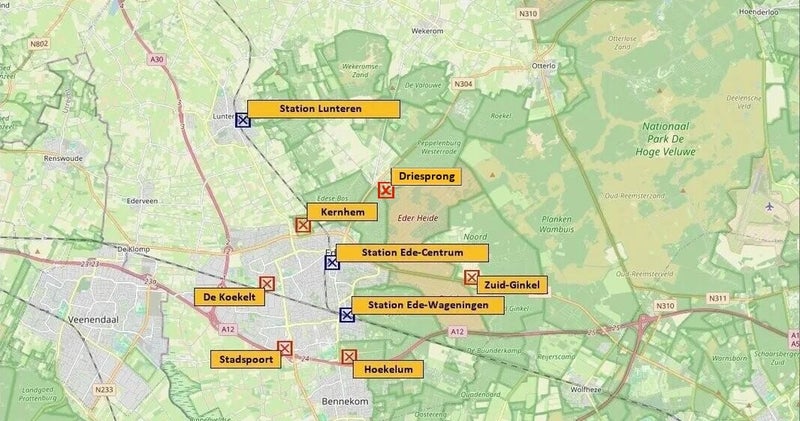Met blauw zijn de beide stations van Ede aangegeven en die in Lunteren.