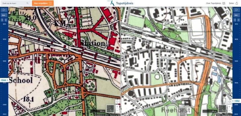 De Parkweg (1) lag 150 jaar geleden niet in Ede, maar in het Buurtschap Maanen (meer westelijk). Na de aanleg van de spoorlijn in 1845 (2), de vestiging van twee kazernes in 1906 (3) en de komst van de ENKA-fabriek in 1922 (4), groeide het dorp Ede naar de buurt Maanen toe en inmiddels is Ede-Zuid gewoon een wijk van Ede. Als vanouds zat hier veel horeca en daar is een klein deel van gebleven. Op de kop (5) zijn recentelijk appartementen gebouwd. In 2024 opent het nieuwe station Ede-Wageningen en dan zal de Parkweg ook weer met de Stationsweg verbonden zijn via een nieuwe tunnel (6). De Parkweg is hét winkelgebied voor de (nieuwe) bewoners van OpEnka en de kazerneterreinen. Alle foto's: Allard Bijlsma. Basiskaart: openstreetmap.org.