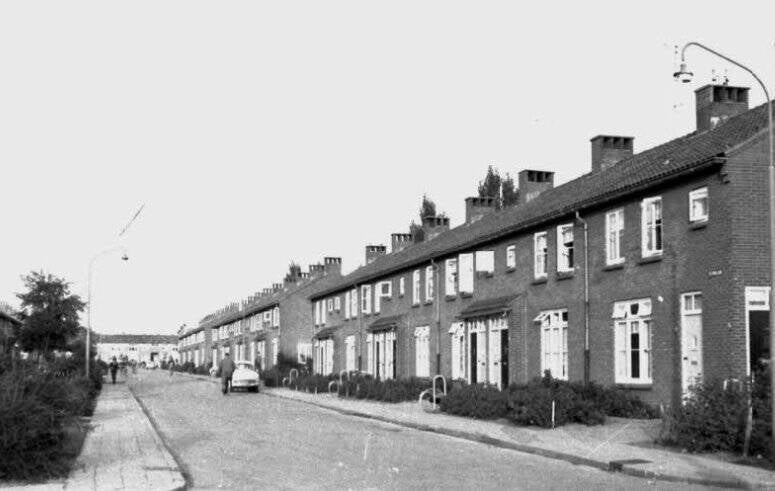 Betreft: bouw van woningen. Op 21 oktober 1947 ontving de gemeente per telegram goedkeuring van het ministerie voor de bouw van 152 montagewoningen. De volgende dag berichtte de gemeente aannemer Dura uit Rotterdam dat het werk aan hem was gegund voor een bedrag van ƒ1.796.000,-. Deze woningen, met een grondoppervlak van 6 x 7 m2, waren aan de oostzijde van de wijk gepland. Alle muren en vloeren waren van slakkenbeton. Het was één van de allereerste projecten van montagebouw in Nederland waar de minister van Wederopbouw en Volkshuisvesting, J. in ’t Veld, eind november persoonlijk kwam kijken (zie foto). [ Bron ].
