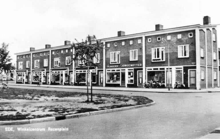 Betreft: Het winkelcentrum aan het Rozenplein in Ede, gezien in oostelijke richting vanaf de Rozenlaan. Gebouwd in 1955. Op de achtergrond de bejaardenwoningen aan de Proosdijerveldweg.