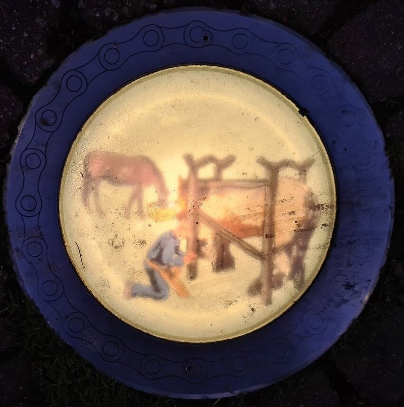 Door de straten van de Bospoort slingert sinds 2013 een ‘ketting’ van 48 grondspots. In elke spot is een afbeelding te zien, die iets toont van het verleden en heden van dit voormalige centrum van Ede. De naam van dit kunstwerk is ‘Bijou’. Bijou is het werk van kunstenaar Michiel Kluiters, gemaakt in opdracht van de gemeente Ede. De route loopt uiteraard door de Bospoort, maar ook via Grotestraat, Posthoornstraat, Notaris Fischerstraat en Amsterdamseweg. Door krassen, vuiligheid en weer-en-wind, zijn veel spots niet goed meer af te lezen. Omdat je ze bij voorkeur in het donker bekijkt, zijn de randen met teksten dan niet meer te lezen. Bij de route is een [ PDF-document ] met een beschrijving van alle 48 onderwerpen beschikbaar. Alle foto's: (c) Allard Bijlsma.