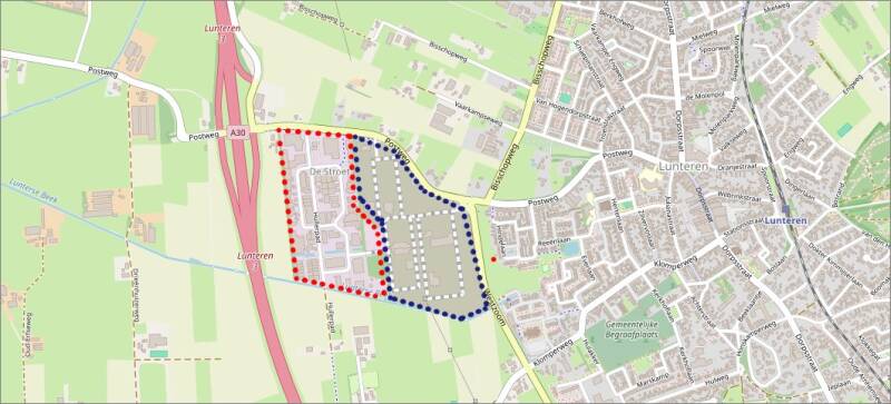 Met rood is het volle deel van De Stroet aangegeven en met blauw het nu te ontwikkelen gebied.