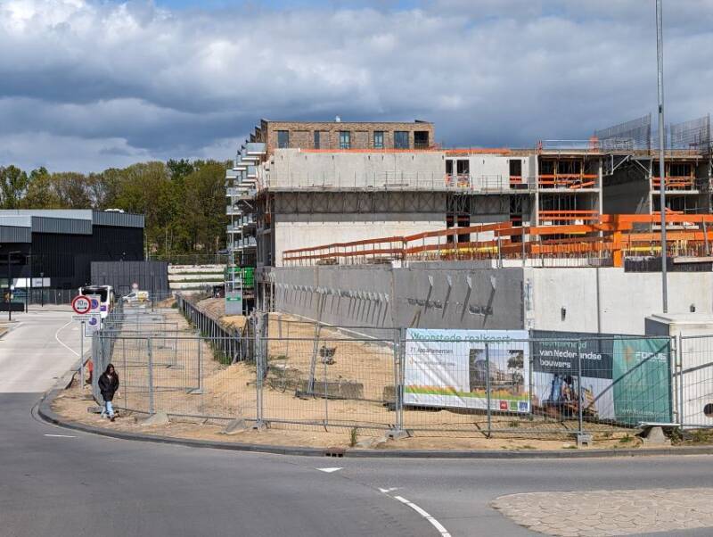 Situatie juni 2023. Op de achtergrond het nieuwe station in aanbouw en gebouw H4 van Woonstede.