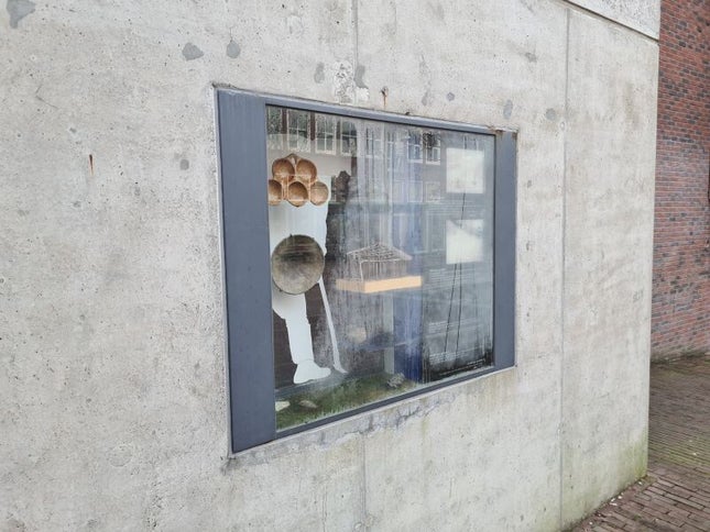 NU: 2022. Nis in de muur van de nieuwbouw aan de Achterdoelen, met vondsten uit meerdere tijdsperiodes. Begin 2022 was de binnenkant van het glas geheel vochtig en daardoor was de inhoud slecht te bekijken. Foto: (c) Allard Bijlsma