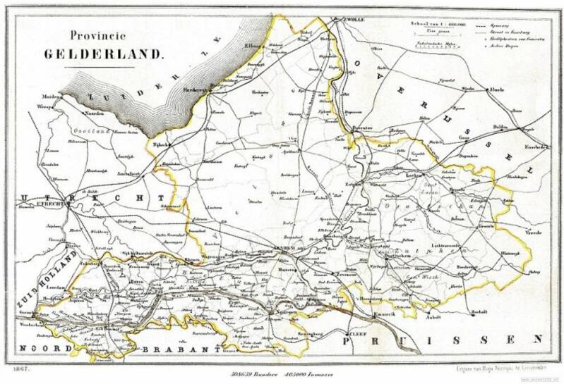 De kaart van Gelderland laat goed zien hoe leeg de Veluwe nog was in 1867. Ede was nog een stipje op de kaart.