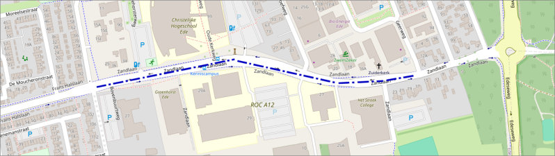 De Zandlaan is nu een doorgaande autoweg die Ede-Oost verbindt met de Rietkampen. Door deze straat te versmallen tot een fietsstraat en de omgeving te vergroenen, ontstaat een heerlijke verblijfsruimte voor de vele duizenden leerlingen en studenten die hier naar school gaan. In het in de kaart aangegeven deel heeft de voetganger en fiets de meeste rechten en mogen auto's slechts 30 km/uur rijden.