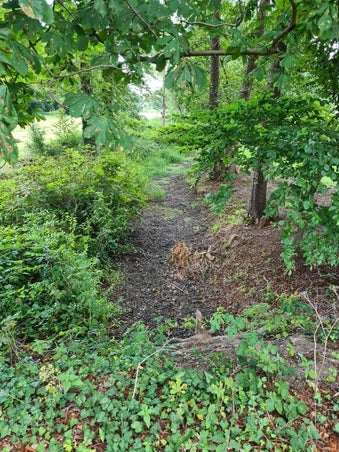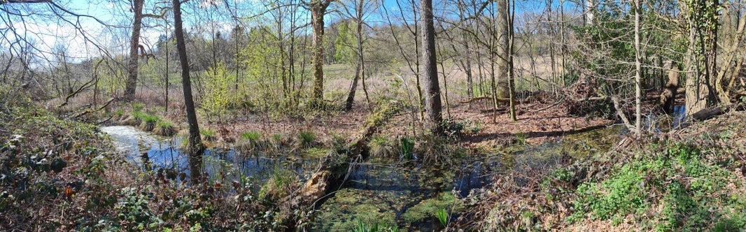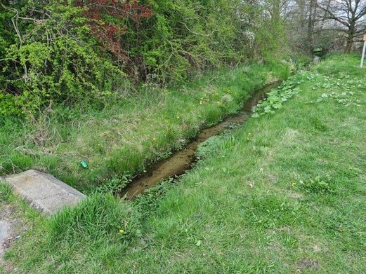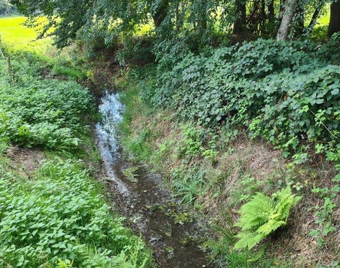 Direct na de Dr. Hartogsweg zien we na een natte periode water in de beek staan. Het stroomt hier nog niet, dus bij droge tijden komt dit ook weer droog te staan. Vanaf hier loopt het water verder af naar het zuiden. Situatie: april 2023.