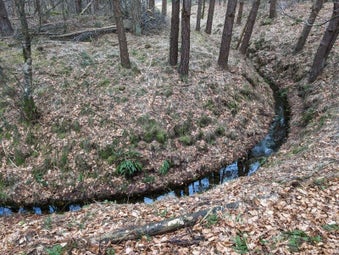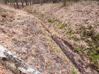 Hier zie je hoe een spreng werkt. Met de hand is hier geprobeerd zo diep te graven, dat het grondwater via de spreng gaat afstromen. Hier (4) lukt dat nog niet: dit dal staat altijd droog, hoe hard het ook regent.