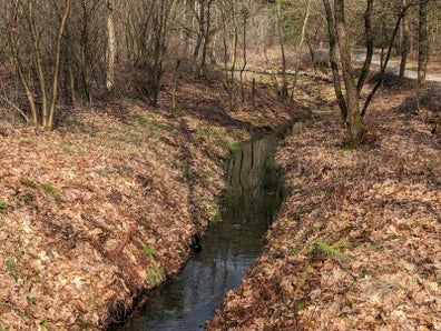 De beek stroomt nu door het bos tussen de A12 en de spoordijk. Tot vele jaren geleden stond dit deel altijd droog. Op de kaart (4).