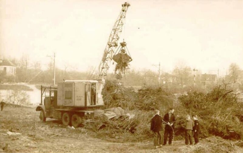 Grondwerkzaamheden door de firma H.E.L.A. uit Ede, voor het te bouwen Gereformeerde bejaardencentrum 't Maanderzand. Het complex verrijst in het Beatrixpark. Geheel links een gedeelte van de achterkant van het hotel De Witte Hinde. Rechts op de achtergrond de pijp van de ENKA. Jaar: 1961. Bron: Vereniging Oud Ede.