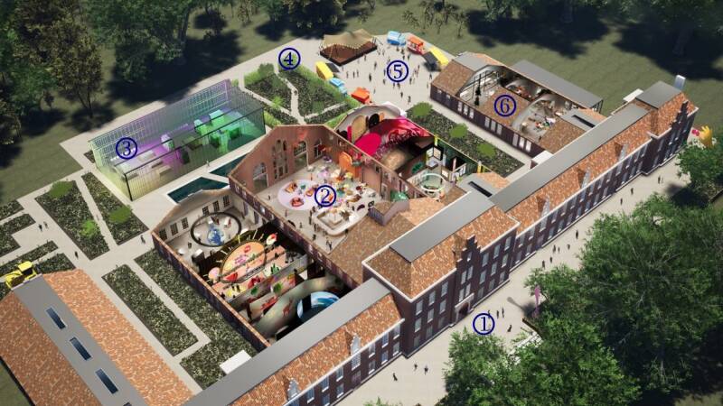 (5) buitenruimte voor thema-evenementen, (6) restaurant, winkel en uitgang.