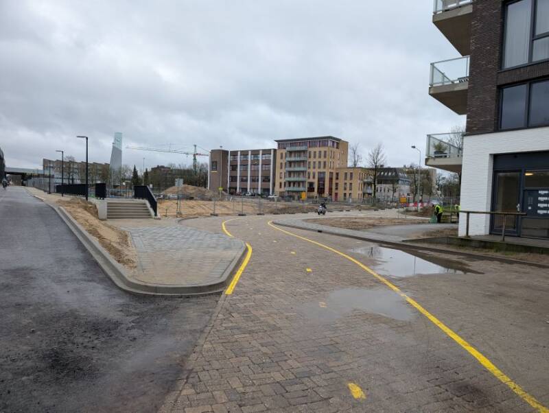 Om duidelijkheid te scheppen in de chaotische situatie die hier is ontstaan, is met de kleur geel een duidelijke loop- en fietsroute naar het station aangegeven. Voor 'Op de Kop' langs is een tijdelijk wandelpad gemaakt, zodat je nog bij de Parkweg kan komen. De autoroute hier, die eigenlijk net weer was hersteld, is nu weer doorbroken en dat zal zeker een jaar zo blijven.
