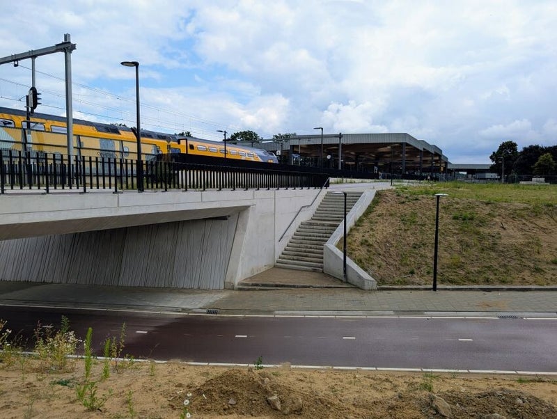 De schuine fietsroute, vanaf station naar de tunnel en vanaf station naar de Oude Bennekomseweg, wordt aangelegd.