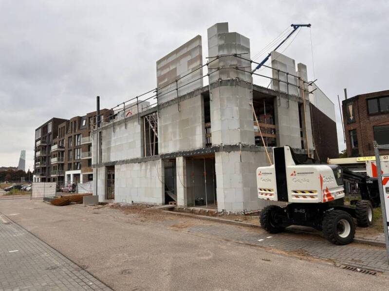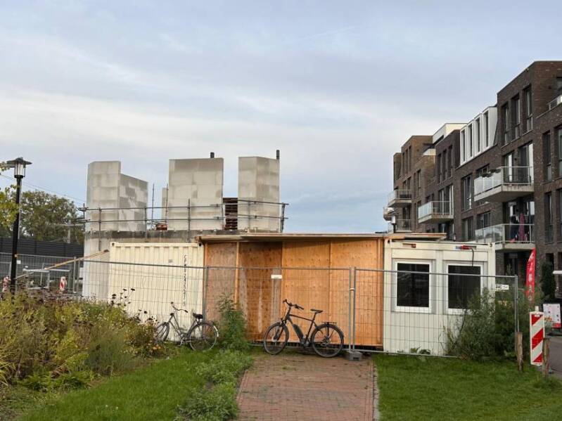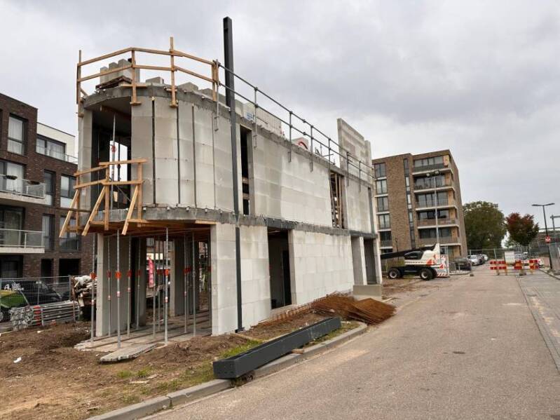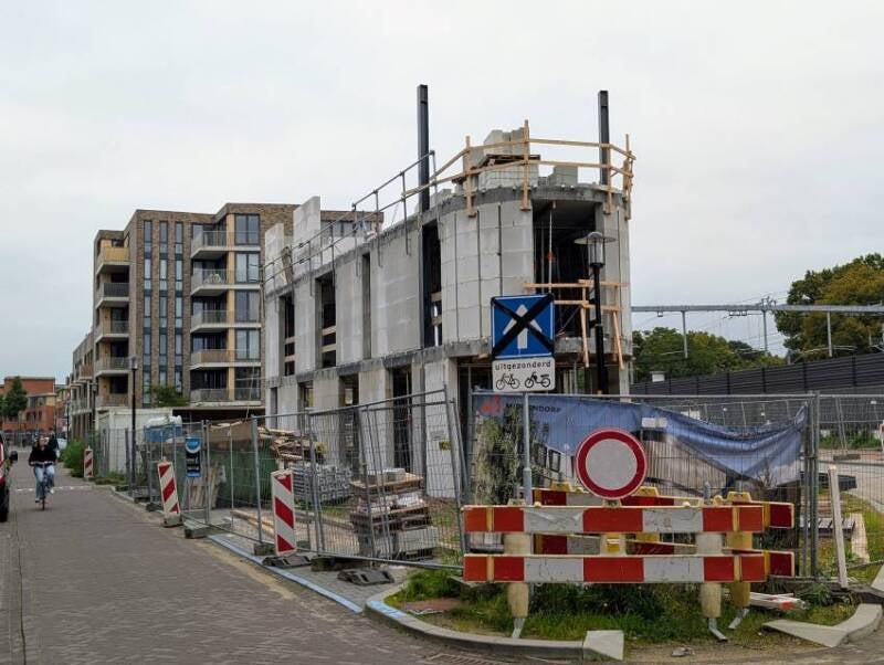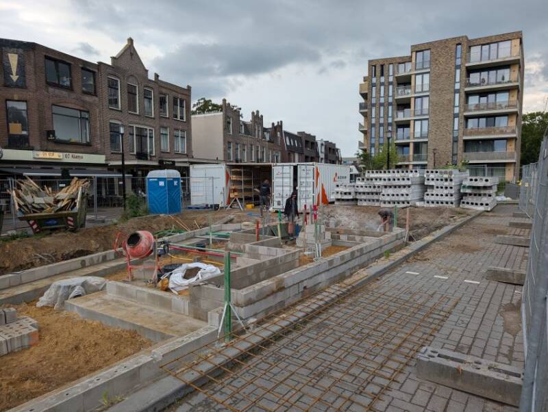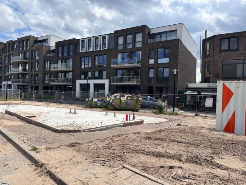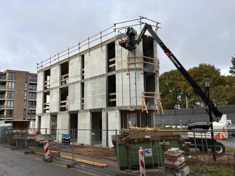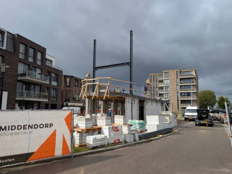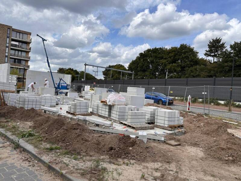 Deze twee foto's, gemaakt door Mieke Tuijn op 29 juli 2025, tonen de voortgang van de bouw op deze locatie. Duidelijk is te zien dat het om een compact gebouw gaat. De studio’s hebben een oppervlakte van 21 m² en werden begin 2025 te koop aangeboden voor €197.000.