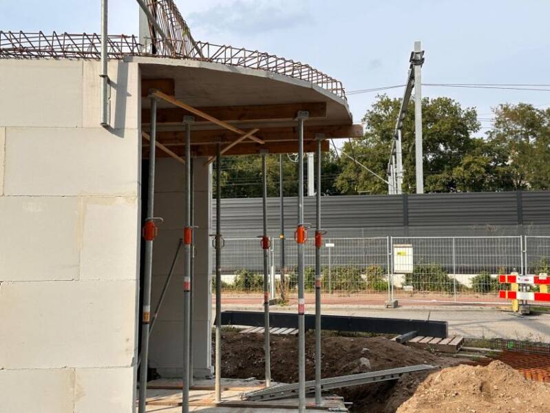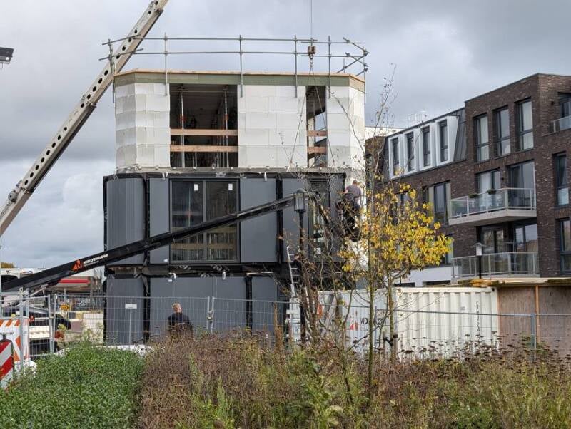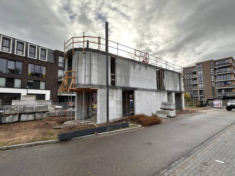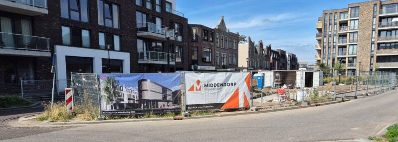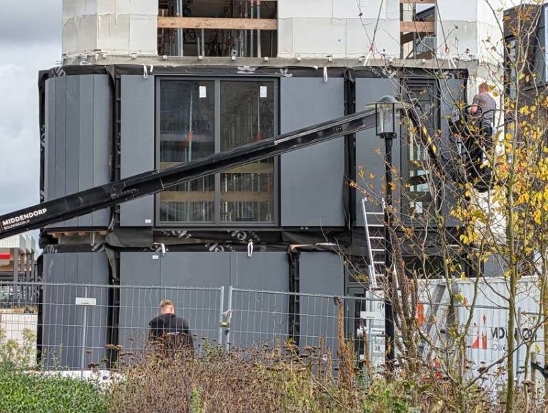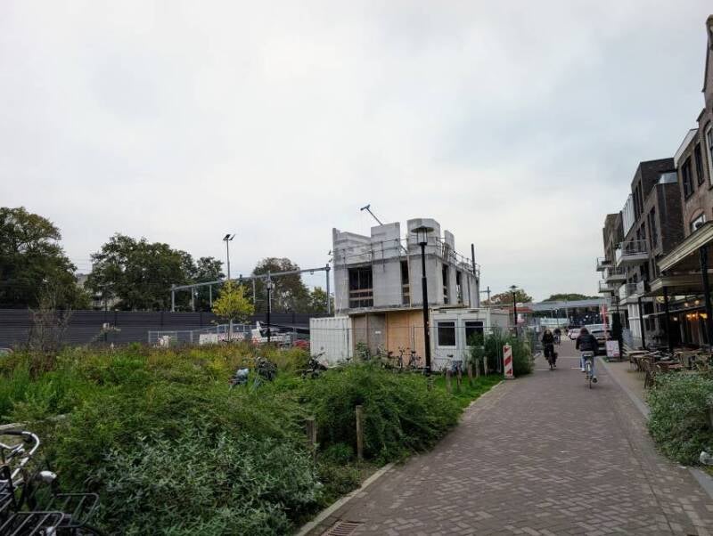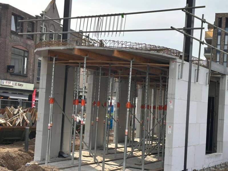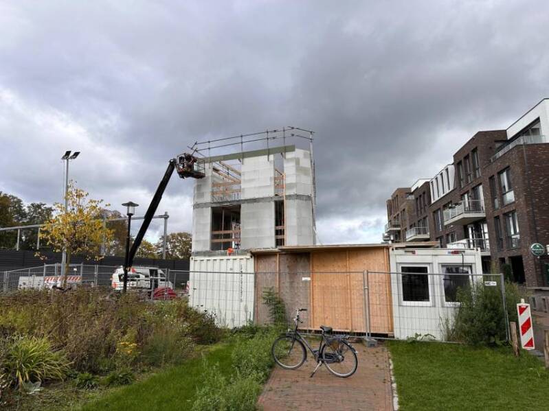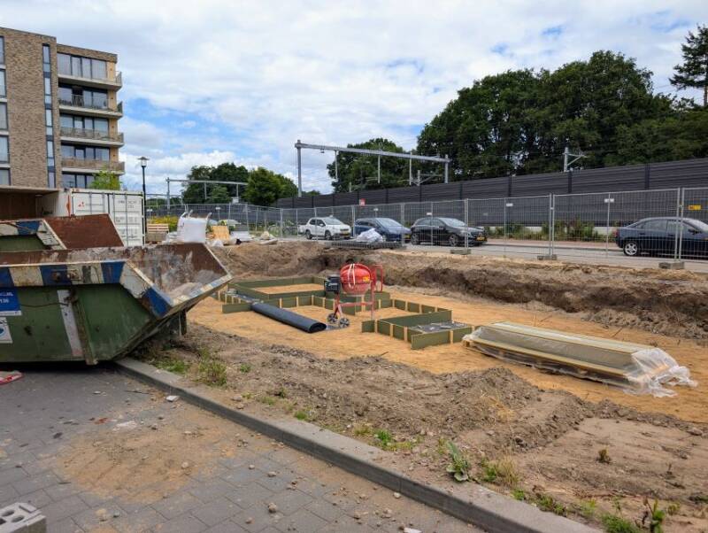Deze twee foto's, gemaakt door Mieke Tuijn op 29 juli 2025, tonen de voortgang van de bouw op deze locatie. Duidelijk is te zien dat het om een compact gebouw gaat. De studio’s hebben een oppervlakte van 21 m² en werden begin 2025 te koop aangeboden voor €197.000.