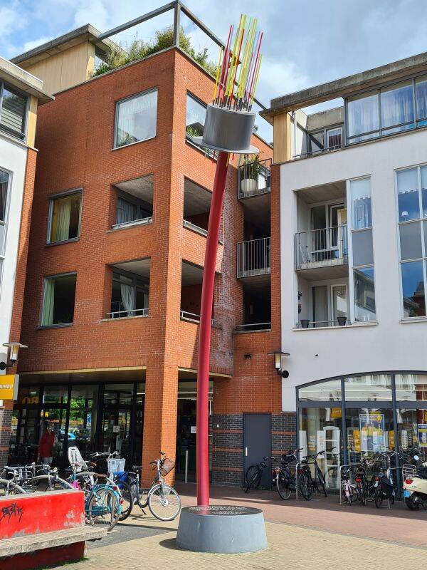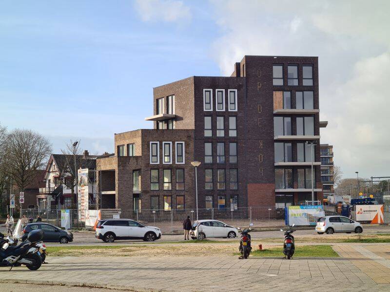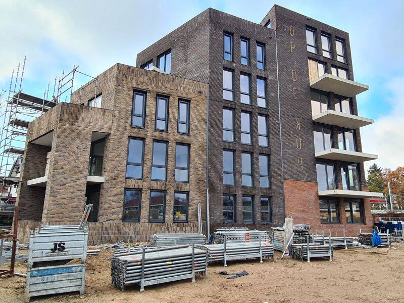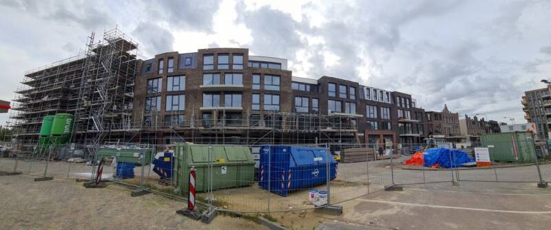 Situatie: 3 november 2022. Inmiddels zijn de steigers verdwenen en de balkons gereed. Het gebouw is inmiddels bewoond.