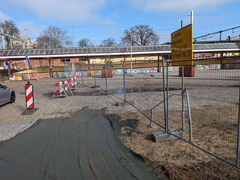 Het einde van de Parkweg wacht op het slopen van het station en de plaatsing van de Westtunnel. Situatie: februari 2024.