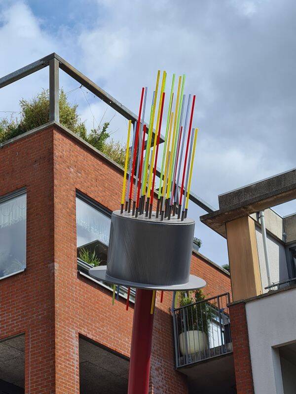 Tekening van de gemeente Ede. Het donkere beeld matcht niet met dat wat op het doek bij het werk te zien is. Het geeft ook een te mooi beeld: in wekelijkheid kijk je rechts uit op een hoge en kale geluidswal. Bron: gemeente Ede.