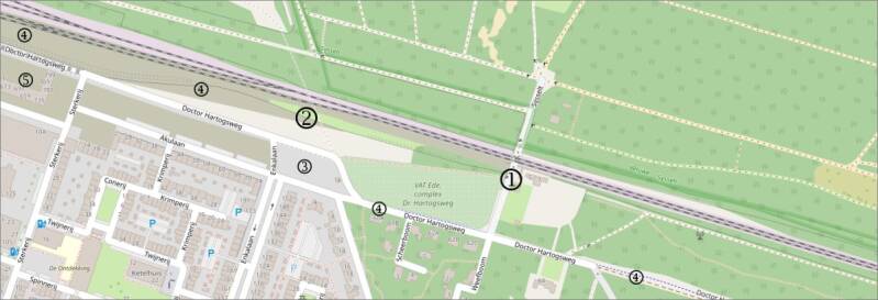 Uitleg bij de kaart: (1)= oude overgang (2) nieuwe viaduct, (3)= gepland appartementengebouw 'De Residentie', (4)= snelfietsroute Veenendaal-Ede-Arnhem, (5)= H2 appartementencomplex (Woonstede).