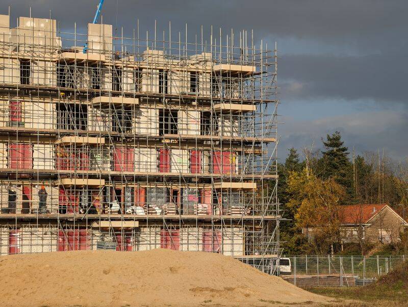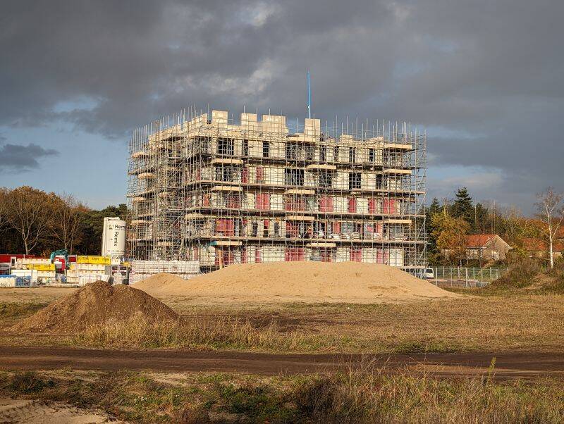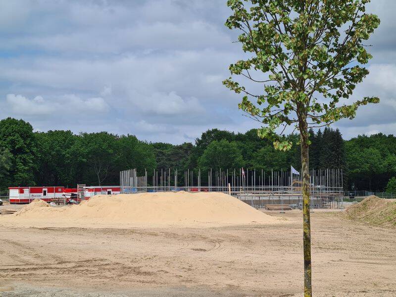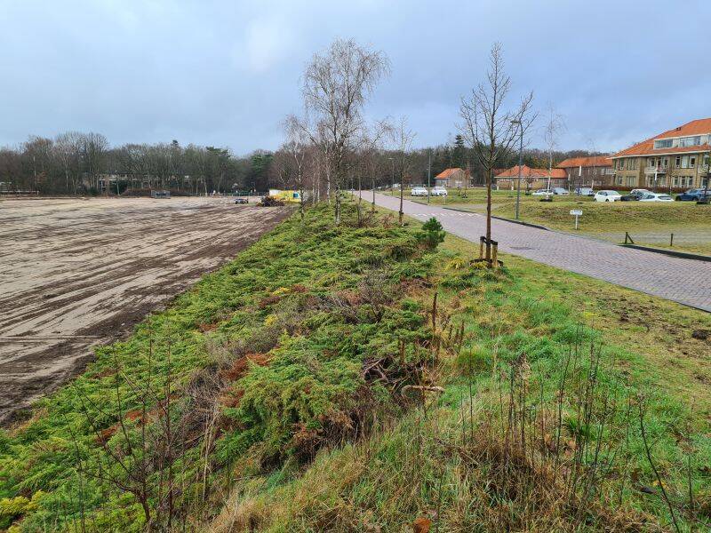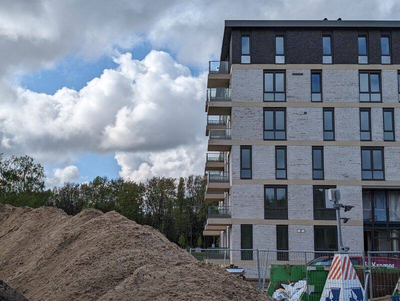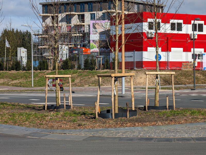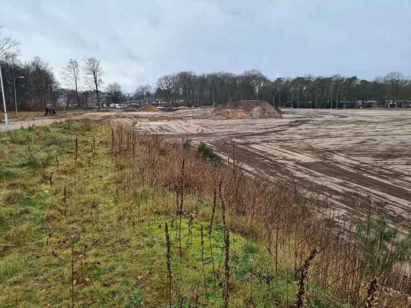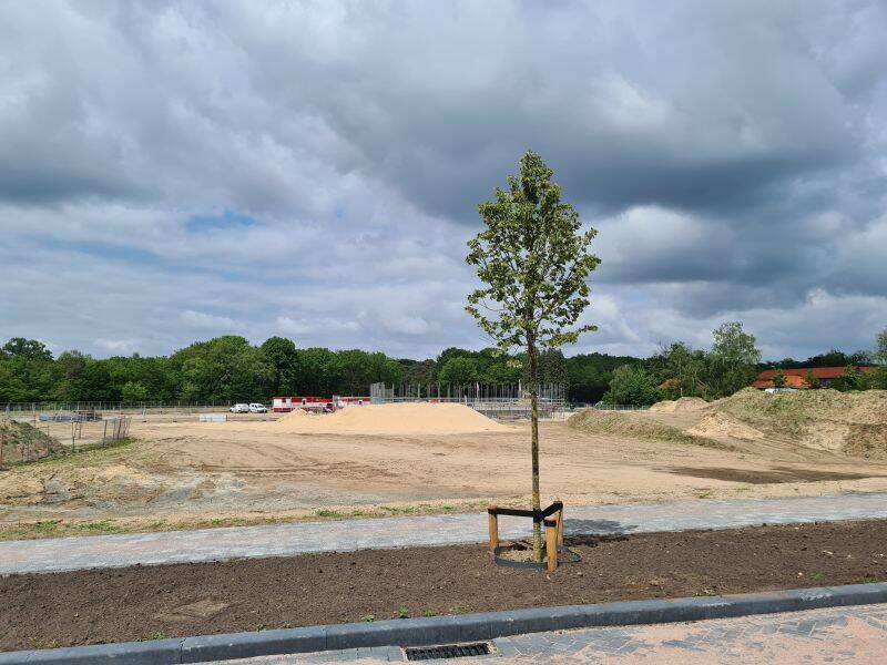 Situatie 24 februari 2023. Zicht richting de Parklaan in aanleg. Rechts staan de oude kazernes 'Elias Beeckman'. In tegenstelling tot de impressietekening van de makelaar, zijn er binnen het bouwgebied geen bomen te zien. Die hebben er de laatste 100 jaar ook niet gestaan.
