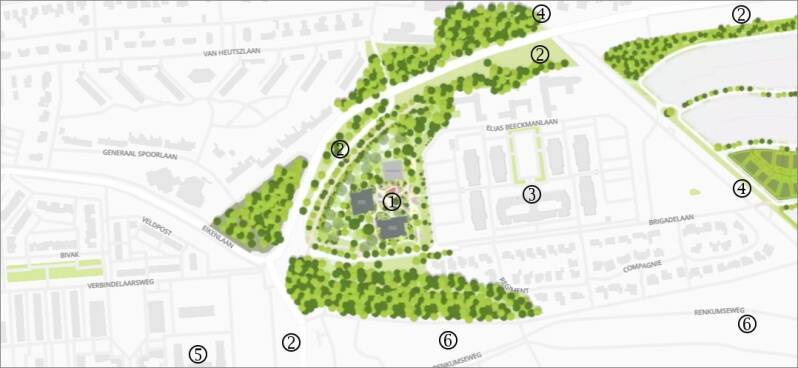 Uitleg bij de nummering: (1)= geplande locatie Helden van de Heide, (2)= Parklaan, inmiddels Generaal Hackettlaan geheten, (3)= vroegere Elias Beeckman-kazerne, (4)= groene bostoegang via Sijsseltselaan, (5)= vroegere Van Essenkazerne (inmiddels woningen), (6)= bosgebied de Sijsselt. Bron kaart: www.nieuwbouw-kazerneterreinen.nl.