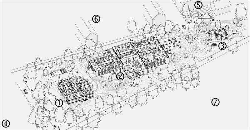 Uitleg bij het plan: (1)= nieuw te bouwen appartementen met parkeren in de kelder, (2)= tot restaurant, werkruimtes en kort-verblijf-units omgebouwd stookgebouw, (3)= het witte huis wordt een bed&breakfast, (4)= locatie De Kolonel, (5)= Smaakpark, (6)=Van Essenkazerne, (7)= Bospark. Bron: Raumplan.