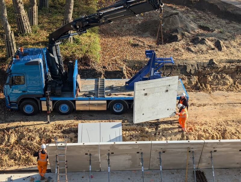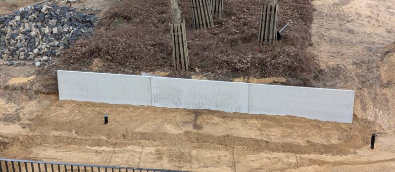 Rond het middaguur van 11 maart 2025 is het eerste deel van de keerwand geplaatst naast het stukje groen met zes esdoorns en de monumentale Amerikaanse eik. Hiervoor is de grond geegaliseerd en er is een laagje cement op gestort. In de loop van de middag stonden de drie hoge delen er.