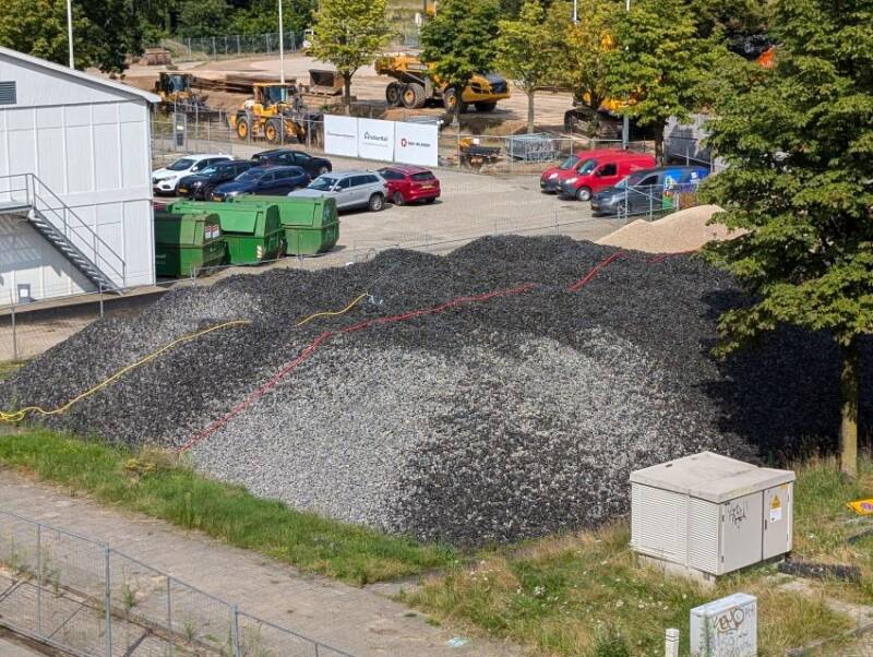 Speciaal voor het inrijden van de tunneldelen, in de tweede week van augustus, worden er vanaf de Keetmolenweg af, honderden metalen grondplaten gelegd voor het geven van stevigheid aan het gele zand hier. Na het plaatsen van de tunneldelen, zullen ze weer worden verwijderd. Deze foto's: 27 juni 2024. Zie voor meer beelden bij pagina [ 'Noordplein' ]
