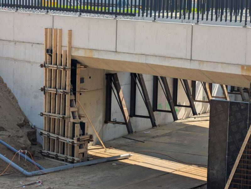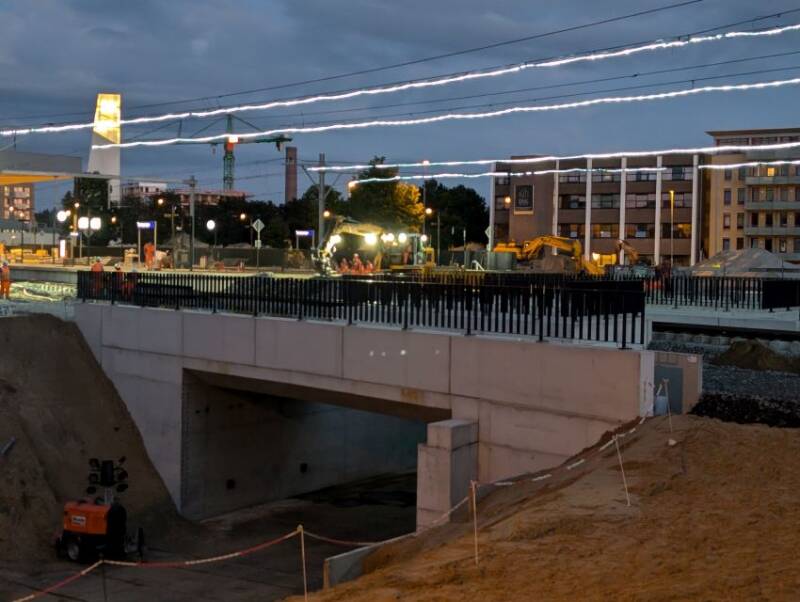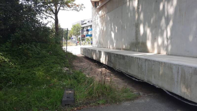 Aan de Parkwegzijde (rechts achter) zijn betonnen muren geplaatst, aansluitend op het fietstunneldeel.