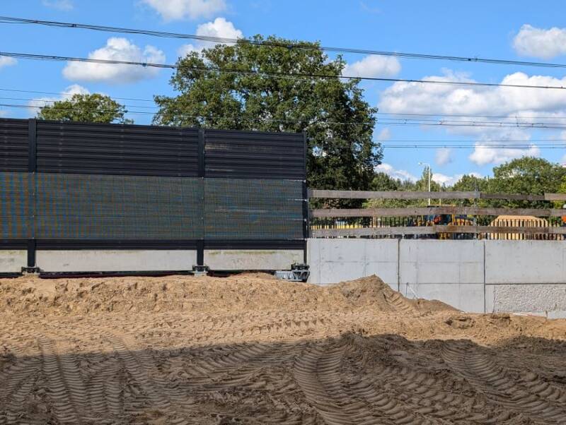 Achter de geluidswal wordt het eerste stuk van het spoor weer terug geplaatst.