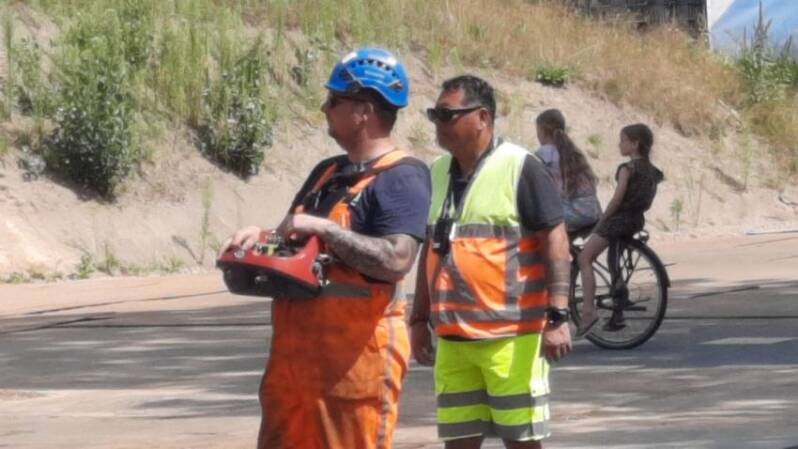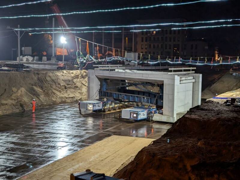 Vanaf 7.00 uur: plaatsing van het tweede deel. Een deel van de metalen rijplaten moet worden verwijderd. Alle GPS-contactpunten zijn weer nagelopen, waardoor het tunneldeel absopluut waterpas kan worden geplaatst. Goed zichtbaar is de kabelgoot, waar straks de bundel kabeld komt, die nu boven het tunneltracé zweeft. Het voorbereidende werk kost veel meer tijd dan het daadwerkelijke inrijden.