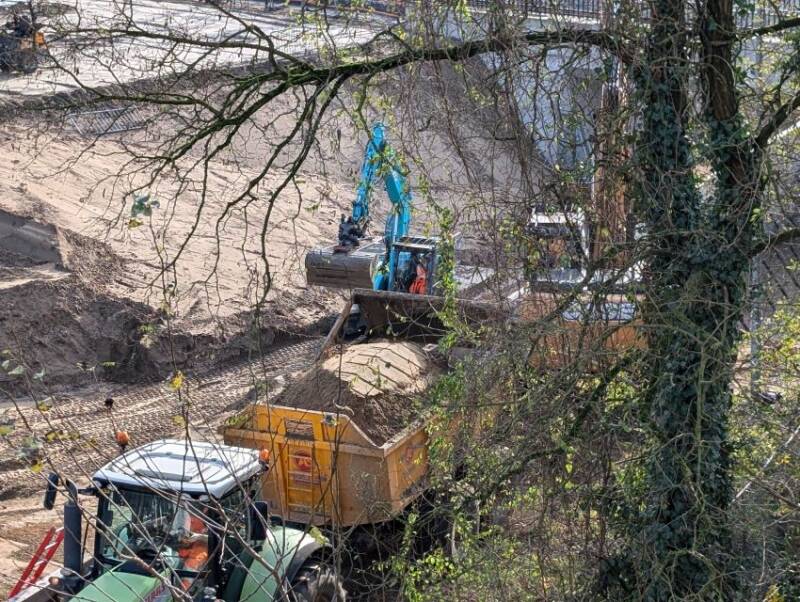 Elke dag gaat er zo wel weer een stukje van het tracé open en dicht. Werd de eerste week van februari een waterafvoerbuis aangelegd, in de week erna was het de beurt aan stroomleidingen. Aan het einde van elke dag zit het meeste weer dicht, waardoor je vaak goed moet kijken om te zien wat er is gebeurd. Soms wordt er alleen een gat gegraven met als doel de diepere ondergrond verder aan te stampen.