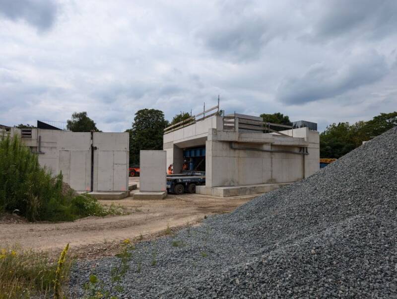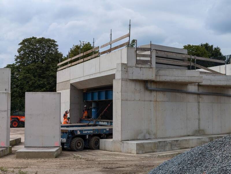 Er zijn betonnen elementen als overgang van tunnel naar het zandlichaam geplaatst. Gestart is met het storten van grind voor het spoorbed. Deze betondelen zijn al begin 2023 gemaakt op het terrein voor de kazernes en bovenop een tunneldeel op 4 augustus hierheen vervoerd.