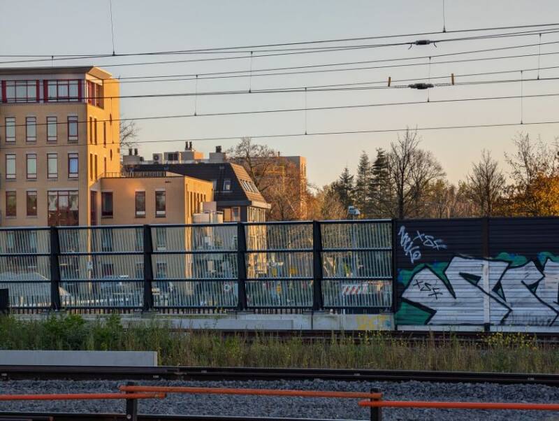 Tussen het spoor en de snelfietsroute is een glazen geluidswal geplaatst.