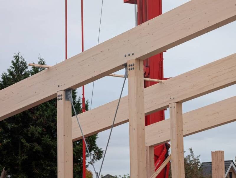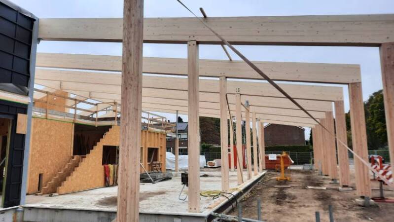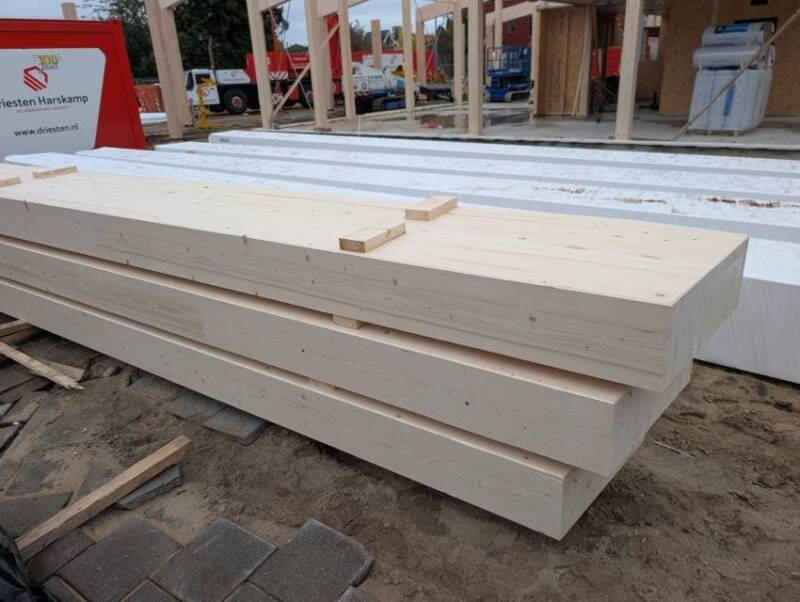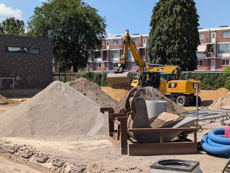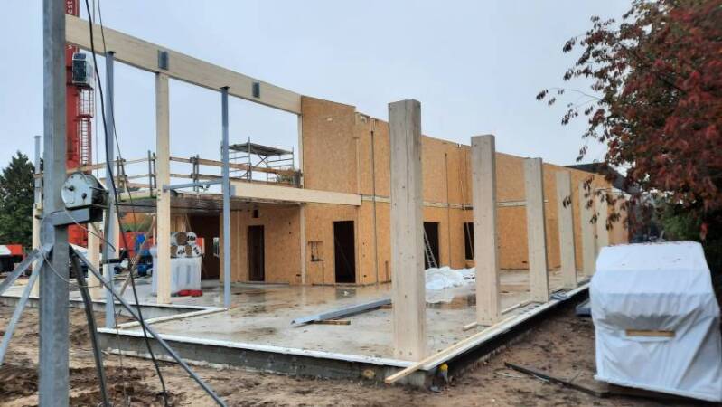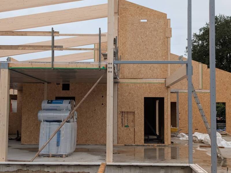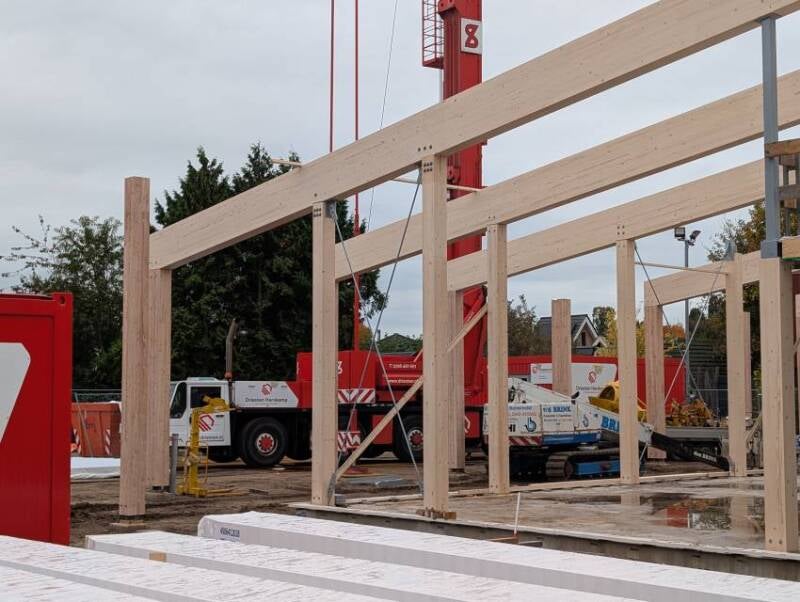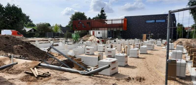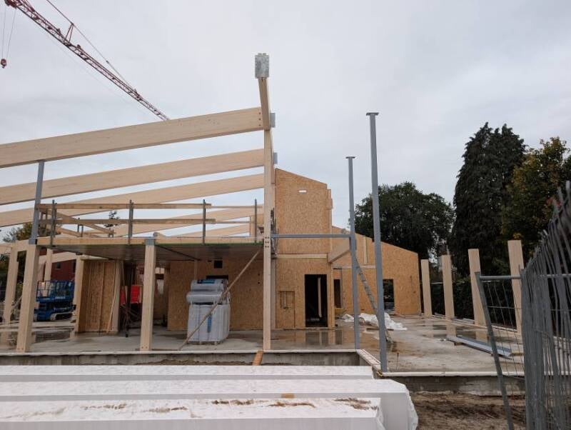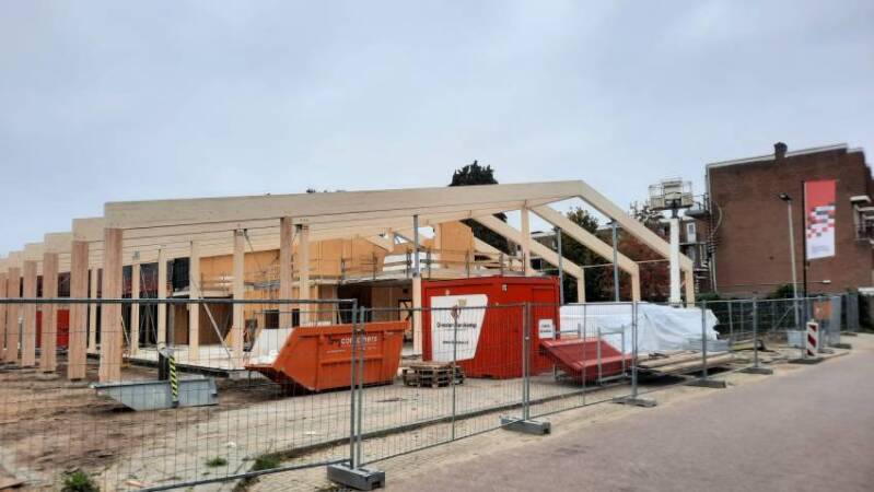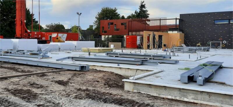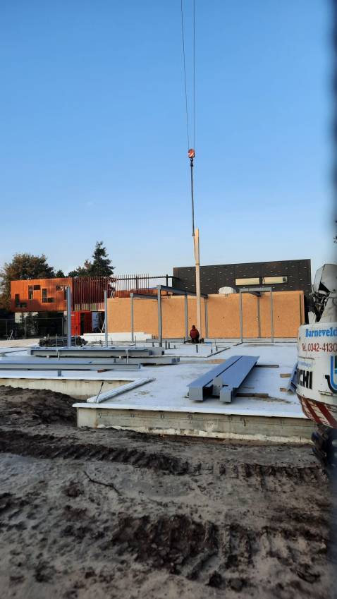 Situatie: 25 september 2025 | Foto's: Nick Engelman. Achteraan is te zien hoe het gebouw prefab gaat worden opgebouwd. Op de voorgrond metalen balken voor het skelet van het gebouw.