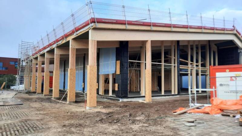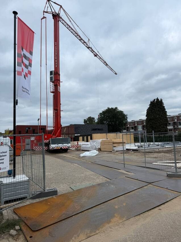 Situatie: 25 september 2025 | Foto's: Nick Engelman. Achteraan is te zien hoe het gebouw prefab gaat worden opgebouwd. Op de voorgrond metalen balken voor het skelet van het gebouw.