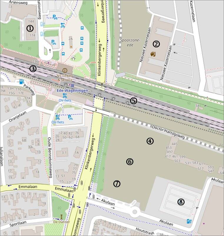 Uitleg bij de oorspronkelijke kaart van het eerste ontwerp: (1)= De Witte Hinde, (2)= Akoesticum, (3)= huidige station uit 1983, (4)= nieuw stationsgebouw, (5)= geplande tunnel, (6)= gepland busstation, (7)= geplande parkeergarage, (8)= gepland appartementencomplex.