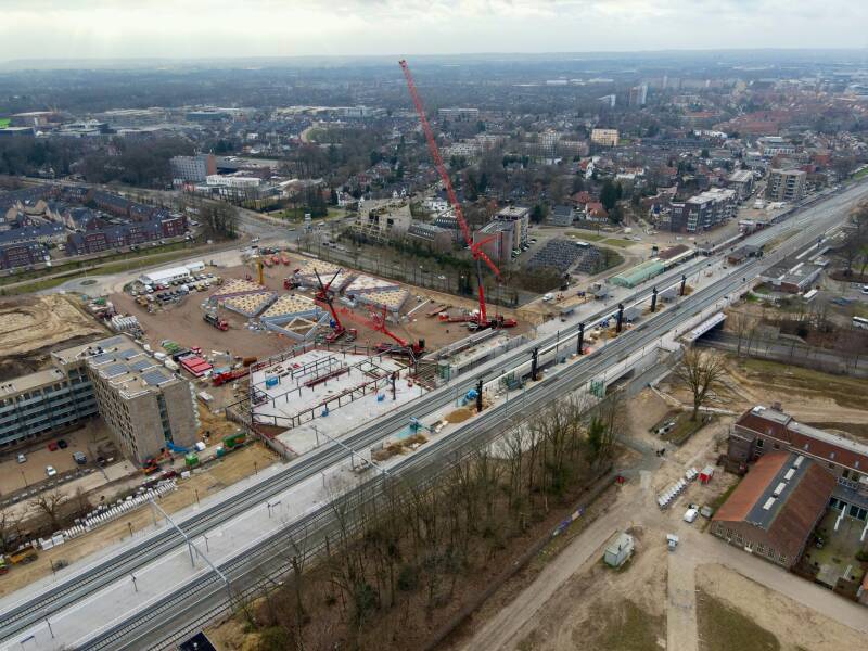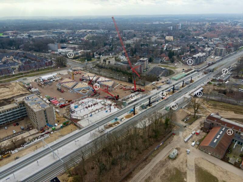 Uitleg bij de nummers: (1)= stationsgebouw en fietsenstalling in opbouw, (2)= perron 3/4 met de eerste zes pijlers geplaatst, (3)= in de maand mei te plaatsen driehoekige dakdelen in opbouw, (4)= Frisokazerne met Akoestikum, (5)= nieuwe tunnel voor het station, (6)= bestaande Albertstunnel, (7)= huidige stationsgebouw, in 2024 af te breken, (8)= het appartementencomplex 'Op de KOP' is bijna klaar, (9)= conferentiecentrum De Reehorst.