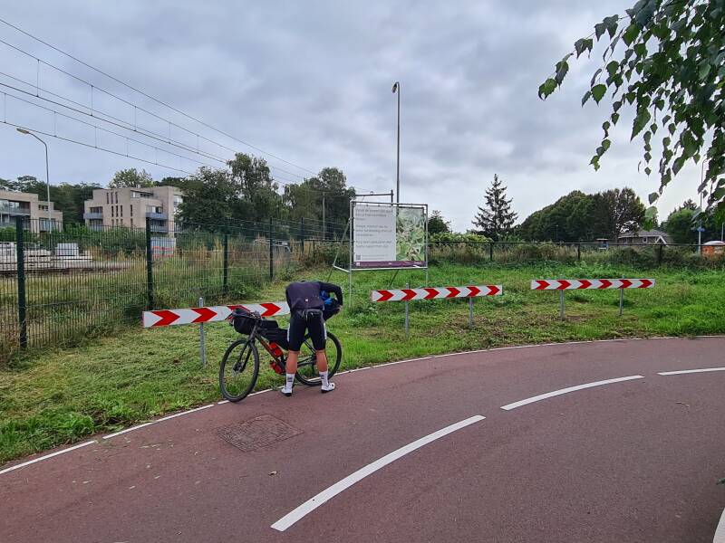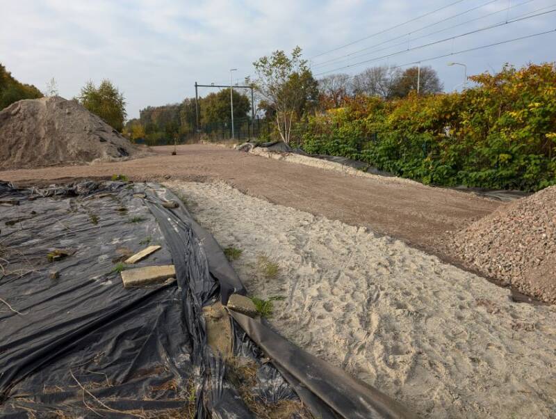 Ter hoogte van de vroeger spoorwegovergang in de Kerkweg, moeten fietsers nu nog enkele scherpe bochten maken. Reden hiervoor is dat dit terrein vergeven is van de Japanse Duizendknoop, een vervelende exoot die alles om zich heen kapot maakt. Medio voorjaar 2024 moeten die zijn verwijderd en dan kan de route worden doorgetrokken. Foto's: september 2023. Een tweede knelpunt is het station Ede-Wageningen. Eind februari 2024 zal dit openen en daarna zal het mogelijk worden om hier direct de fietsenstalling in te rijden of door te fietsen richting Arnhem.