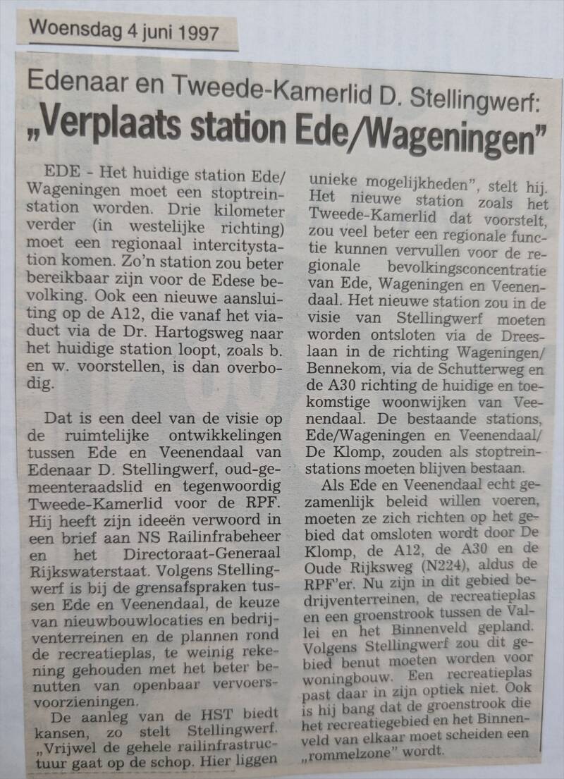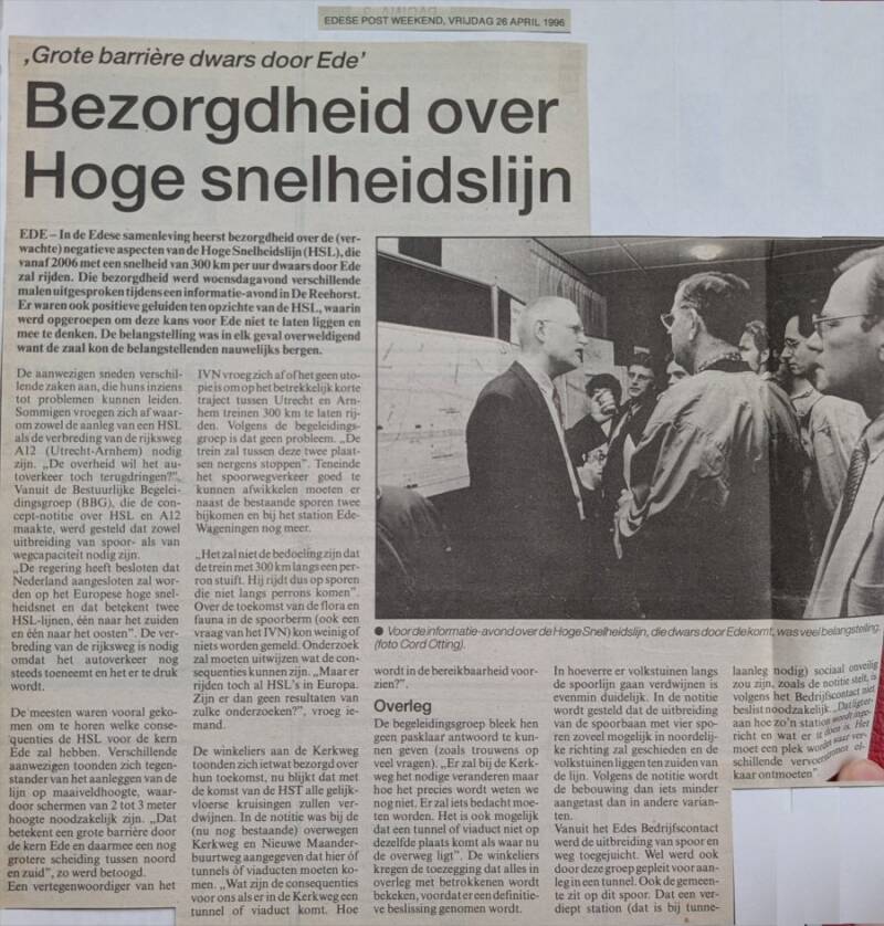 Hij is er nooit gekomen, maar in de jaren '90 was Ede in de ban van de mogelijke komst van hogesnelheidstreinen, die met 300 km per uur Ede voorbij zouden razen. De trein die anno nu het snelst aan Ede voorbij rijdt, is de ICE van Amsterdam naar Frankfurt (Duitsland). Die rijdt ter hoogte van Ede maar 140 km per uur. De topsnelheid tot 300 km per uur wordt alleen in Duitsland gehaald. Op deze pagina wat artikelen uit die tijd. Klik op een artikel om hem vergroot te kunnen bekijken. Alle foto's: (c) Allard Bijlsma.