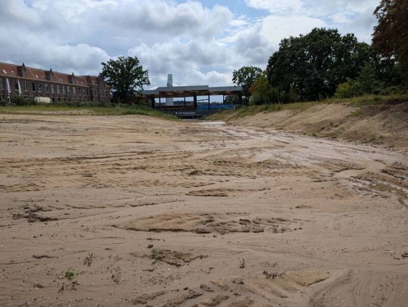Er zijn de afgelopen maand twee dammen opgeworpen om modder en water weg te houden uit de spoortunnel. Op 1 augustus stond het na één regenbui al vol achter de eerste dam. Ben benieuwd wat er gebeurt als het echt gaat regenen en of de bezinkbekkens tussen de twee dammen dan al werken. Zo niet, dan loopt de stationstunnel vol met modderwater. Een groot gebied watert hier op af en nergens is begroeiing te vinden, die het water afremt of opneemt.