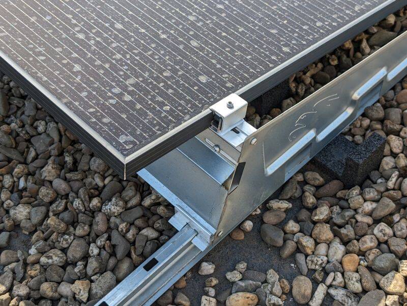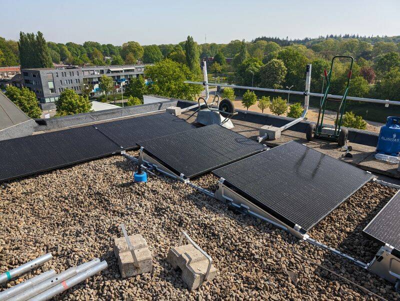 De zonnepanalen liggen optimaal gericht op het zuiden. De panelen liggen op aluminium strips, met onder elk paneel enkele grote stoeptegels