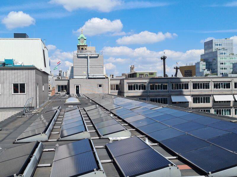 Omdat in april 2024 het bitumen van het gehele dak moest worden vervangen, bleek dat direct een mooi moment om 45 zonnepanelen te plaatsen. Omdat het gebouw drie torens heeft, met elk eigen stroomgroepen voor de lift en de verlichting hier, is besloten ook de opgewekte stroom in drie batches (drie omvormers) aan te bieden aan het stroomnet. Mei 2024 lag er een nieuw dak op het gehele gebouw en tevens waren de 45 zonnepanelen aangesloten. Gekozen is voor hoge kwaliteit panelen en voor het iets schuin plaatsen richting het zuiden. Het bedrijf dat men heeft ingeschakeld, heeft zowel het dak vervangen als ook direct de zonnepanelen geplaatst. Er was dus maar één kraan nodig om alles omhoog te krijgen (op 6e verdieping) en het werk kon in één run achter elkaar door worden uitgevoerd.