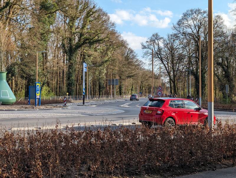 Begin februari is het kruispunt met de Zandlaan geasfalteerd. Ook het dubbele fietspad is nu goed zichtbaar. Het voetpad komt aan de kasteelkant en het fietspad aan de tuinhuiskant. Het wegdeel ter hoogte van de Reehorst moet nog geasfalteerd worden. Alle foto's: (c) Allard Bijlsma.