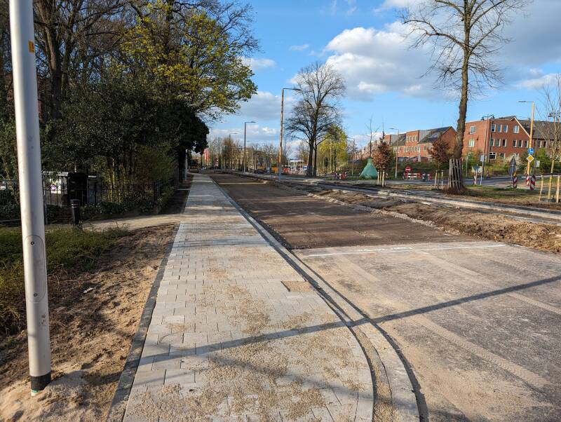 Het allerlaatste deel van de Bennekomseweg dat nog geasfalteerd moet worden. Het dubbele fietspad moet nog voorzien worden van een rode toplaag. Situatie 6 maart 2024.