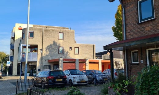 NU: 2021. Rechts op de begane grond de nieuwe Cavaljéschool. Je kijkt vanaf de Brouwerstraat de Veenderweg in.